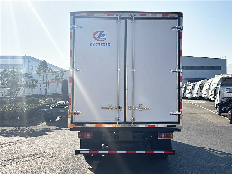 廂體配置:采用我公司液壓吸附一體成型生產線制造,保溫性能達到國家A級標準,廂體內外面料采用最新款納米玻璃鋼(不吸光、隔熱性好、硬度強、抗氧化),廂體厚度為8cm,內襯骨架為防銹處理武鋼優質輕鋼型材,保溫材料為無空隙填充聚氨酯發泡,廂體底部為鋁合金花紋板或選平面納米玻璃鋼,廂體采用鍍鋅不銹鋼包角,加厚型鋁合金包邊,后門框為不銹鋼,加厚型不銹鋼后門合頁及鎖件,廂體內部采用LED照明燈及廂體示寬燈。